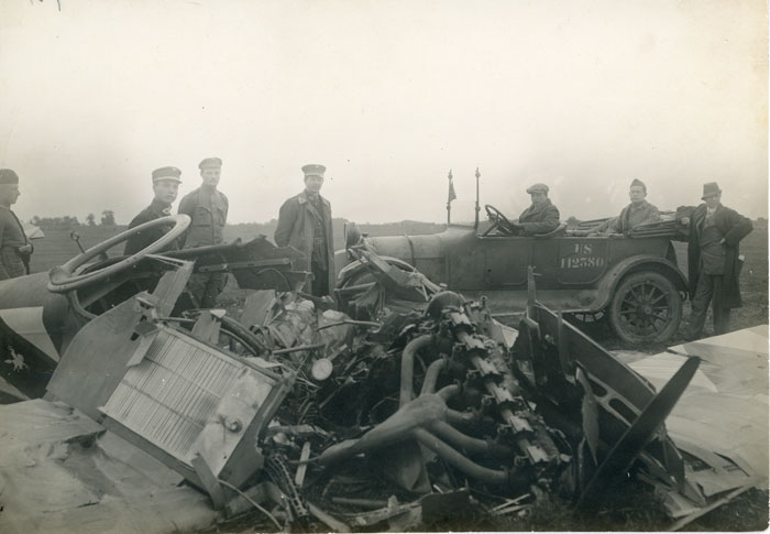 Iš kairės į dešinę: budintis kariūnas Leonas Virbickas, Aviacijos mokyklos viršininkas kapitonas Jonas Martynas Laurinaitis, oro žvalgas Zigmas Knystautas, Aviacijos dalies vadas pulkininkas Petras Petronis, JAV atstovų automobilio vairuotojas, karininkas, užsienio svečius lydintis asmuo. Kaunas, 1919 m. rugsėjo 28 d.