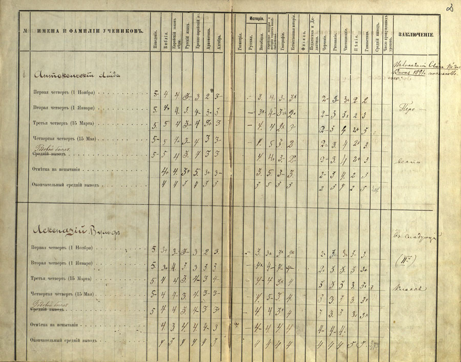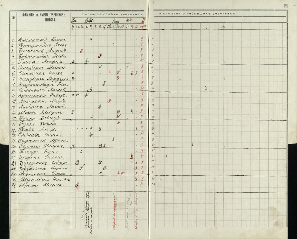 Vilniaus žydų mokytojų instituto mokinių pažangumo žurnalas (defektuotas), kuriame surašyti I–IV klasių auklėtiniai, jų pasiekimai (mokslo metų ketvirčių ir metiniai), elgesio įvertinimai. Pirmos klasės mokiniai mokėsi 15 dalykų, pažymiu buvo vertinamas ir jų elgesys; antroje klasėje (21 mokinys) prisidėdavo geometrija ir fizika, trečioje klasėje (18 mokinių) – pedagogika ir didaktika. Žurnale pirmasis įrašytas Leiba Antokolskis (Лейба Антокольский). Žurnalas patvirtintas direktoriaus V. Spaskio (В. Спасский) parašu.