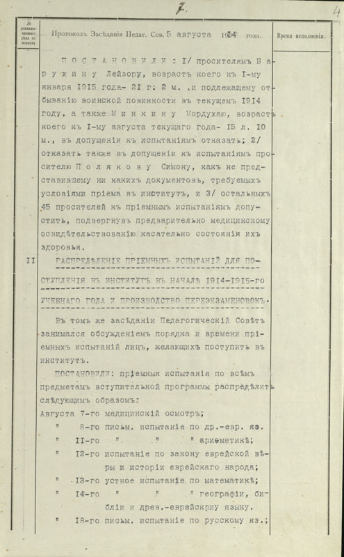 Vilniaus žydų mokytojų instituto pedagogų tarybos posėdžių protokolai. Svarstyti stojančiųjų žinių tikrinimo rezultatai, mokymo programos, stipendijų skyrimas, instituto pastatų šildymas, sąskaitos, galimybė paremti daiktais Vilniaus žydų bendruomenės laikinąjį komitetą, teikusį paramą sužeistiems Rusijos armijos kariams, ir kiti klausimai.