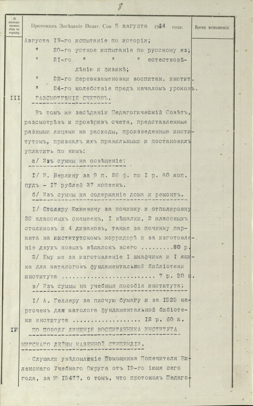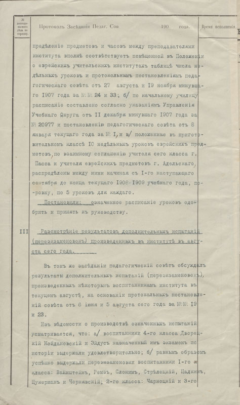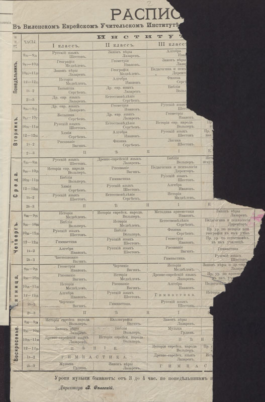 Pedagogų tarybos posėdyje patvirtintas Vilniaus žydų mokytojų instituto pamokų planas 1908/1909 mokslo metams. Išlikusioje dokumento dalyje matyti, kaip dėstomieji dalykai buvo paskirstyti pagal klases, kiek vykdavo pamokų per dieną.