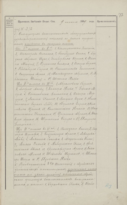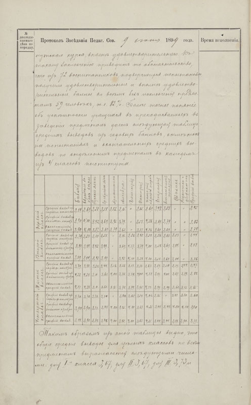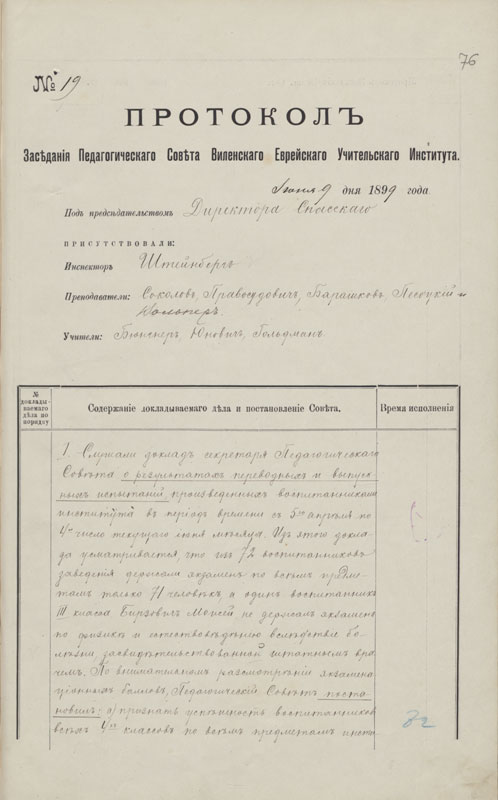 Vilniaus žydų mokytojų instituto pedagogų tarybos posėdžio protokolas, baigiantis 1898/1899 mokslo metams. Pateikta statistika apie mokinius, jų skaičių ir elgesį; pažangumo vidurkiai (suvestinė). Yra perkeltų į aukštesnes klases mokinių sąrašai.
