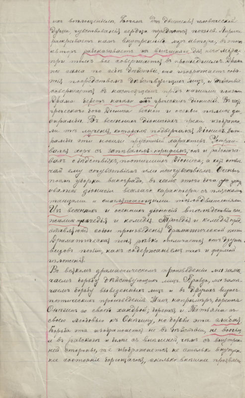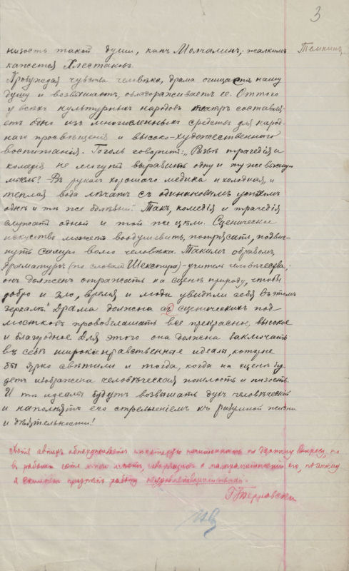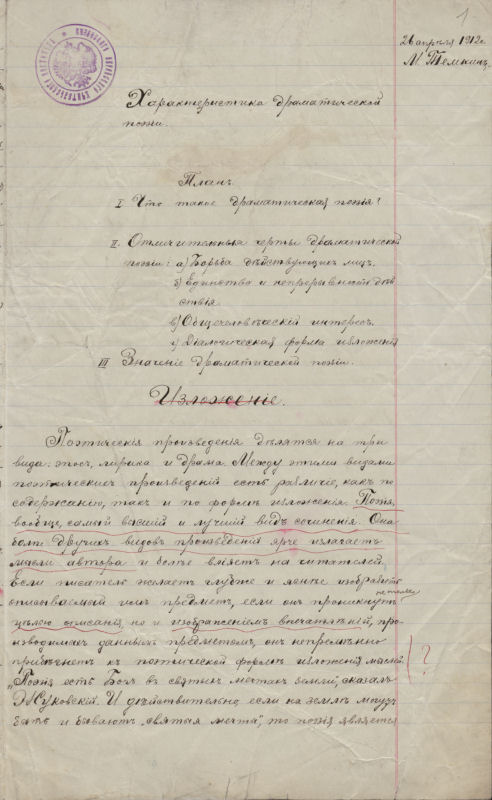 Vilniaus žydų mokytojų instituto auklėtinio M. Temkino rašinys iš rusų literatūros „Draminės poezijos charakteristika“, kurį mokytojas G. Teravskis (Г. Терравский) įvertino nepatenkinamai.