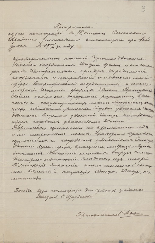 Vilniaus žydų mokytojų instituto kosmografijos kurso programa IV klasei, nurodytas atitinkamas vadovėlis – S. Ščerbakovo „Kosmografijos kursas vidurinėms mokykloms“ (С. Щербаков „Курс космографии для средних учебных заведений“).