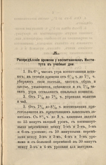 Remiantis šiomis Vilniaus žydų mokytojų instituto auklėtinių taisyklėmis (p. 3–4), auklėtinių dienotvarkė buvo tokia: