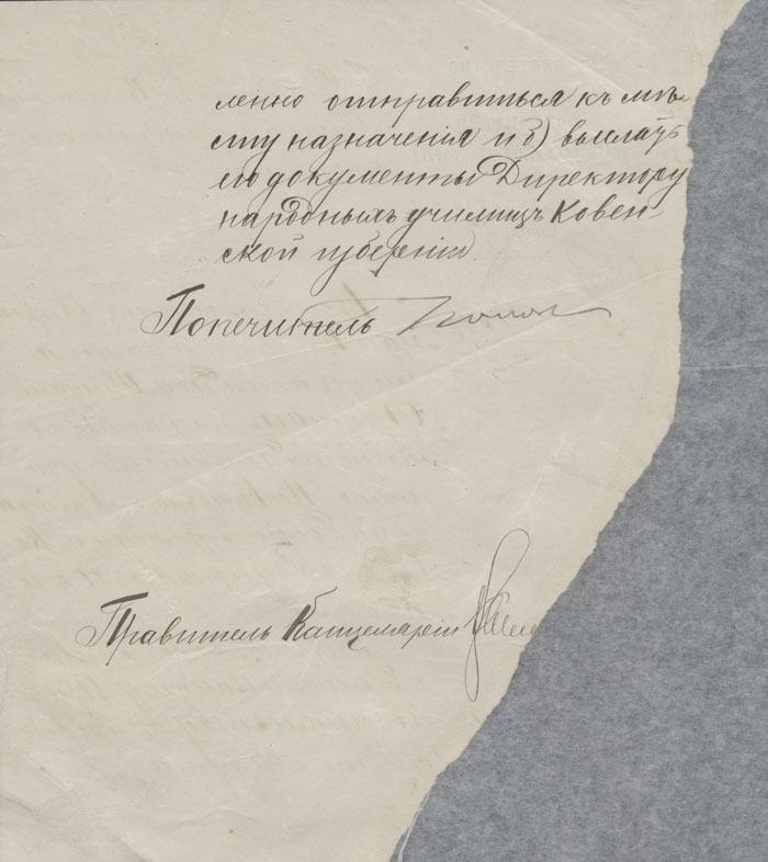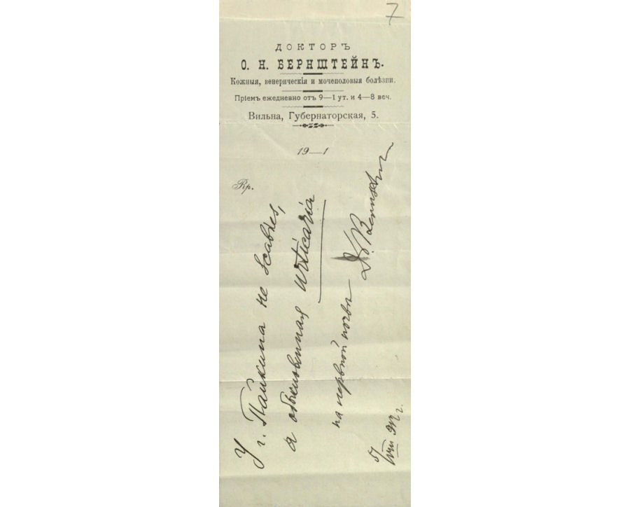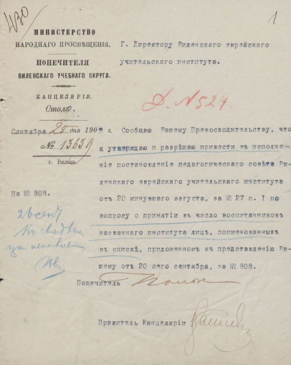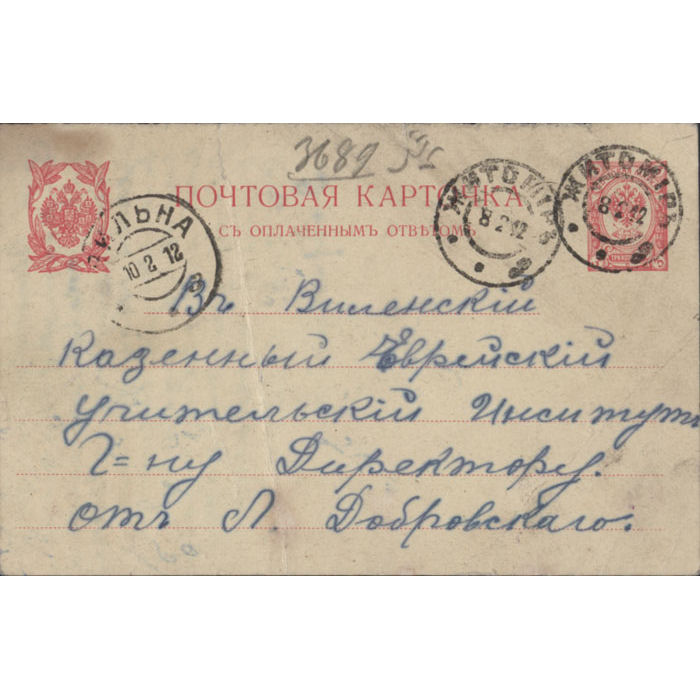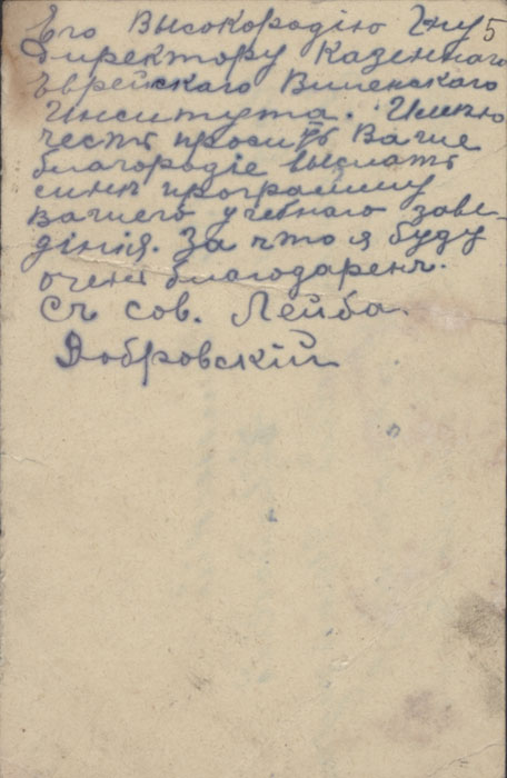 Vilniaus žydų mokytojų instituto direktoriui adresuotas atvirlaiškis, kuriame valstybės patarėjas Leiba Dobrovskis (статский советник Лейба Добровский) iš Žytomyro (dab. Ukraina) prašo atsiųsti instituto programą.