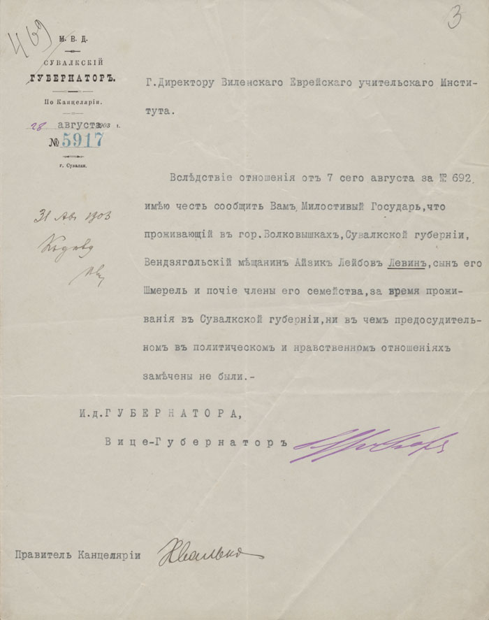 Suvalkų gubernatoriaus kanceliarijos išduota pažyma, adresuota Vilniaus žydų mokytojų instituto direktoriui. Joje nurodyta, kad Vilkaviškyje (Suvalkų gubernija) gyvenančio Aiziko Levino (Айзик Лейбовъ Левин), jo sūnaus Šmerelio (Шмерель) ir kitų šeimos narių elgesyje, jiems gyvenant Suvalkų gubernijoje, nebuvo pastebėta nieko smerktino politiniu ar doroviniu atžvilgiu. Pažymą pasirašė vicegubernatorius
