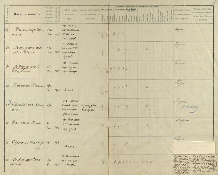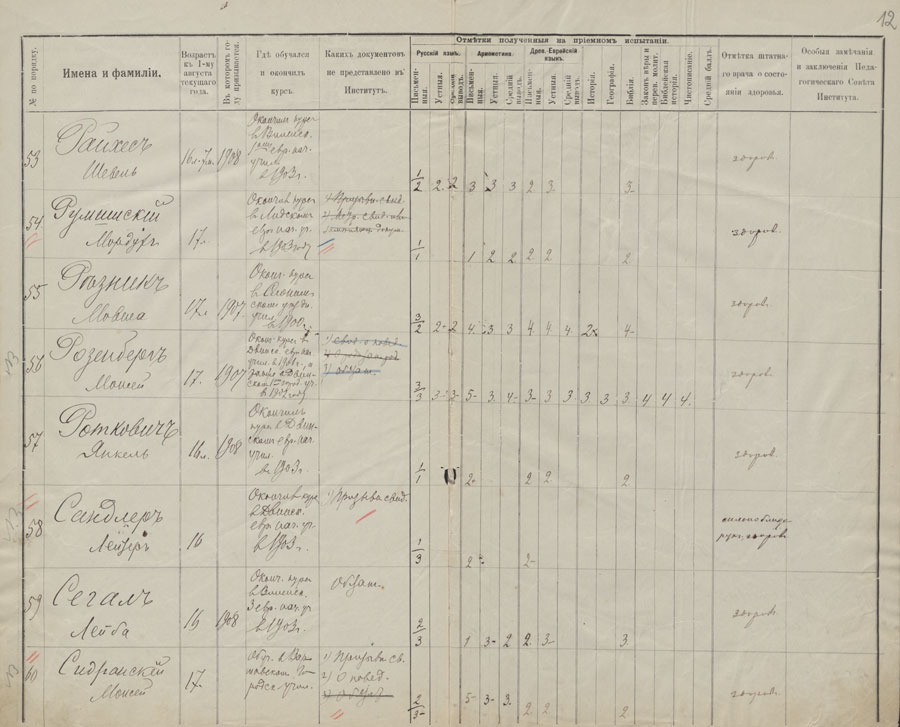 Stojančiųjų į Vilniaus žydų mokytojų institutą registracijos knygoje atsiskleidžia 1912 m. padėtis. Tąkart institute mokytis norėjo 100 kandidatų (du iš jų neturėjo 16 metų, dar du buvo sulaukę 25 metų, tačiau visi jie dėl skirtingų priežasčių nebuvo priimti).