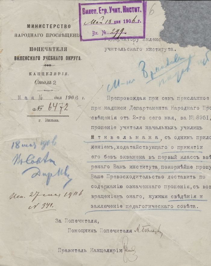 Pradinių mokyklų mokytojo Štivelmano (Штивельман) prašymas su paaiškinimu, kurį Vilniaus švietimo apygardos patikėtinio kanceliarija persiuntė Vilniaus žydų mokytojų institutui. Štivelmanas norėjo būti priimtas į instituto pirmąją klasę be žinių patikrinimo, prašė suteikti reikiamą informaciją ir pranešti apie Pedagogų tarybos sprendimą.