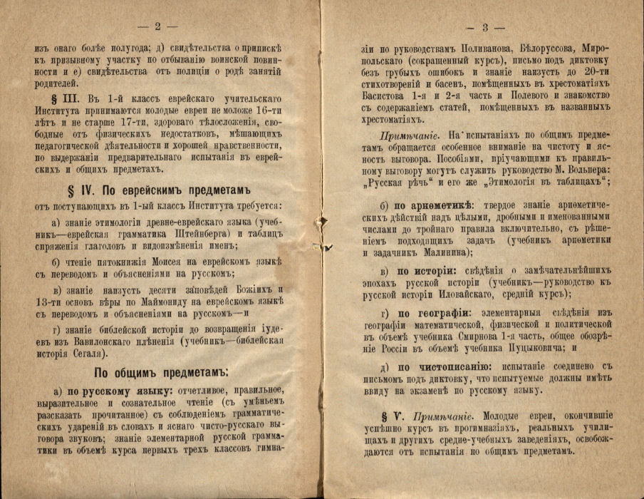 1888 metais Vilniuje išspausdintas informacinis leidinys „Programos ir priėmimo sąlygos į Vilniaus žydų mokytojų institutą bei prie jo [įsteigtą] pradinę vienklasę žydų mokyklą su paruošiamąja klase“. Priėmimo sąlygos į mokytojų institutą nustatytos penkiolikoje paragrafų, dar vienuolika paragrafų apibrėžė priėmimą į pradinę mokyklą.