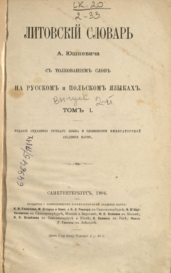 Dėl A. Juškevičiaus „Lietuvių kalbos žodyno“ I sąsiuvinio kainų ir egzempliorių.
