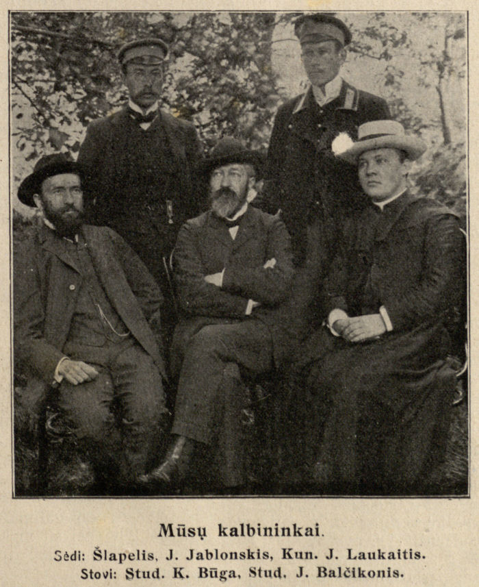 Nuotraukoje: sėdi J. Šlapelis, J. Jablonskis, kun. J. Laukaitis. Stovi: stud. K. Būga, stud. J. Balčikonis.