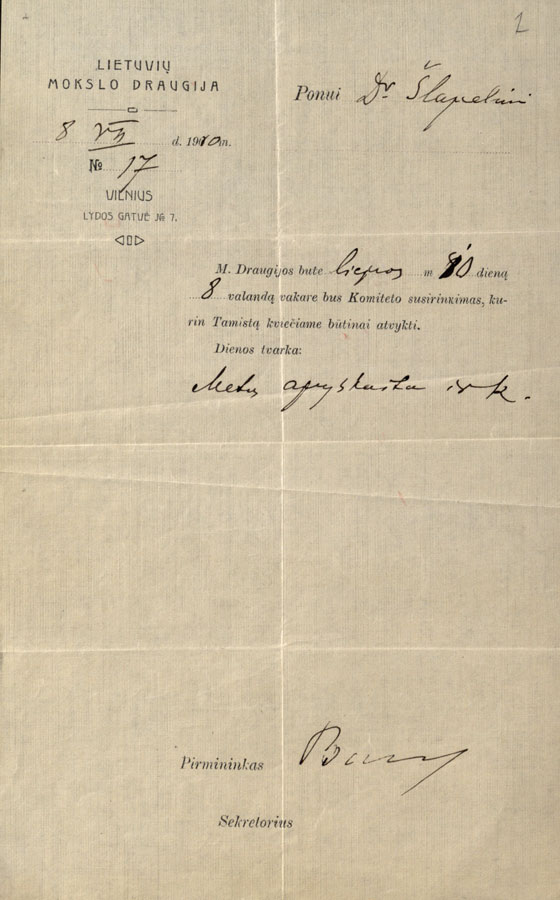 J. Basanavičiaus ranka rašyta knygų sąskaita dėl „Lietuvių tautos“ įsigijimo ir kvietimas atvykti į Lietuvių mokslo draugijos komiteto susirinkimą dėl metų ataskaitos aptarimo.