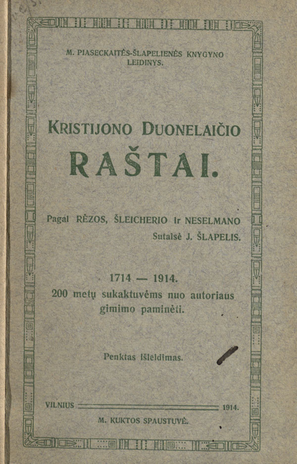 Kaip pažymi tyrėjai, pirmasis knygos lankas buvo atspausdintas dar 1909 m., tačiau visa knyga skaitytoją pasiekė tik 1914 m. Todėl knygoje nurodytos dvi išleidimo datos: antraštiniame puslapyje atspausdinta 1909 m. data, o knygos viršelyje nurodyta tikroji – 1914 m. data. Tai – pirmasis K. Donelaičio raštų leidimas atskira knyga pačioje Lietuvoje.