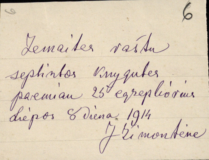 Rašytojos Julijos Žymantienės (Žemaitės) pakvitavimas dėl pasiimtų savo raštų egzempliorių.