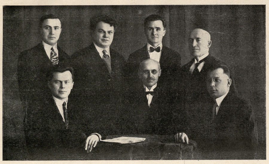 Stovi iš kairės: Adomas Juškevičius, sekretorius Stasys Matjošaitis, vicepirmininkai Bronius Untulis ir dr. Jurgis Šlapelis. Sėdi: bibliotekininkas Povilas Karazija, pirmininkas Marcelinas Šikšnys, iždininkas dr. Danielius Alseika.