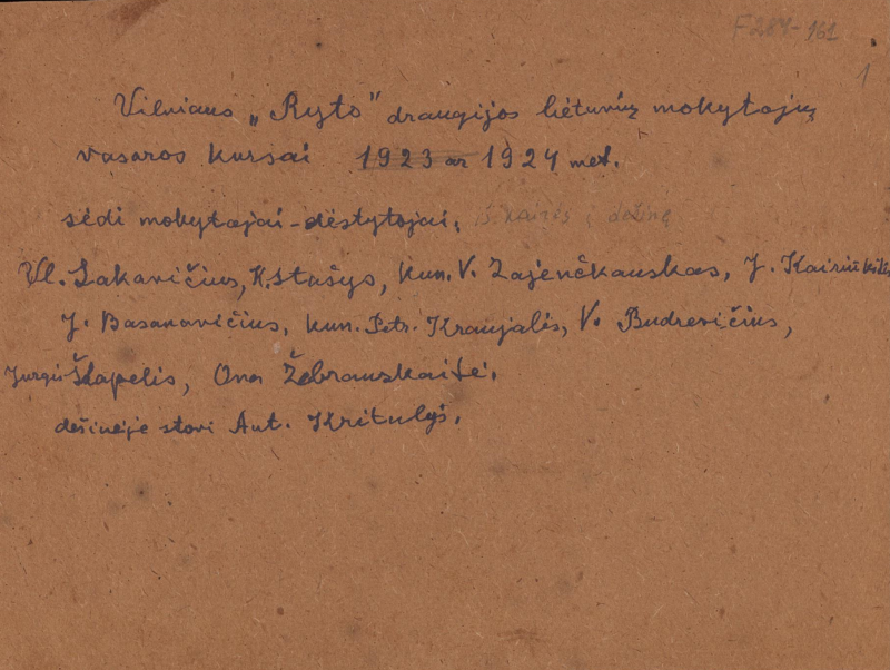 Iš kairės į dešinę sėdi mokytojai: Vl. Sakavičius, Konstantinas Stašys, kun. V. Zajančkauskas, Juozas Kairiūkštis, Jonas Basanavičius, kun. Petras Kraujalis, Vincas Budrevičius, Jurgis Šlapelis, Ona Žebrauskaitė. Dešinėje stovi Antanas Krutulys.