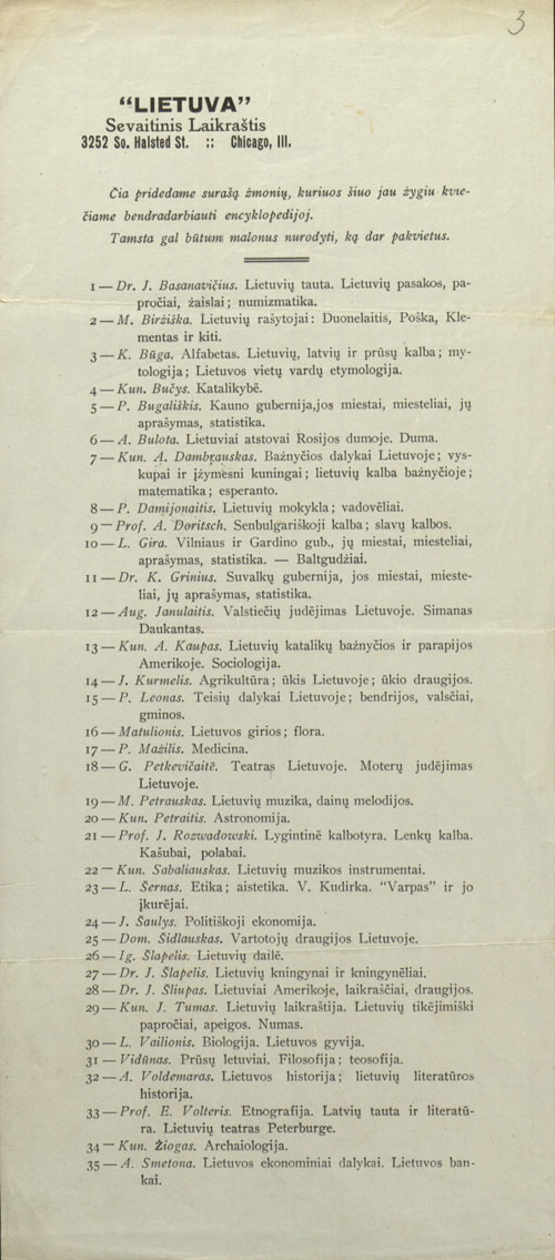 Antano Olšausko sumanytos leisti lietuviškos enciklopedijos Čikagoje siūlomas bendradarbių sąrašas. Tarp jų ir J. Šlapelis.