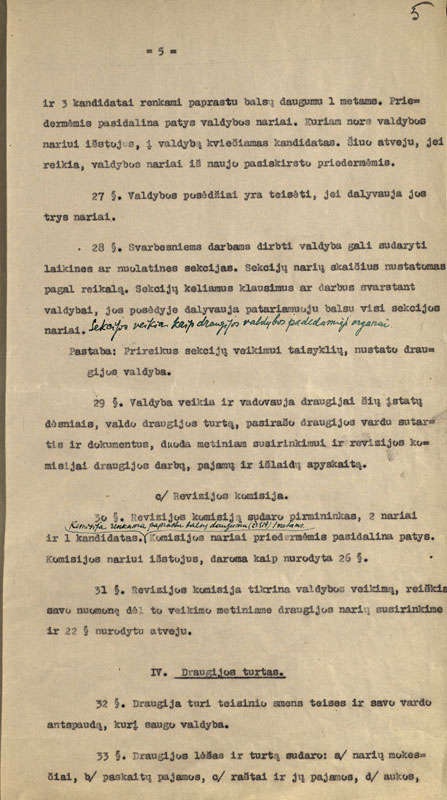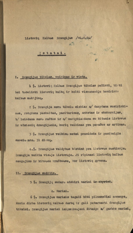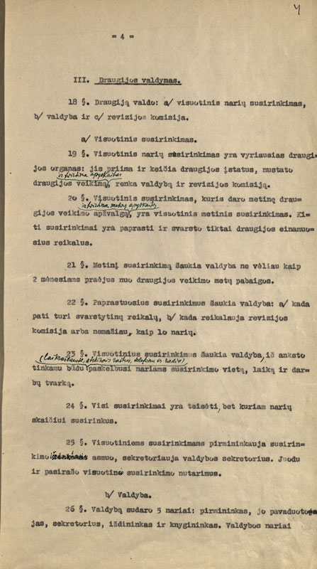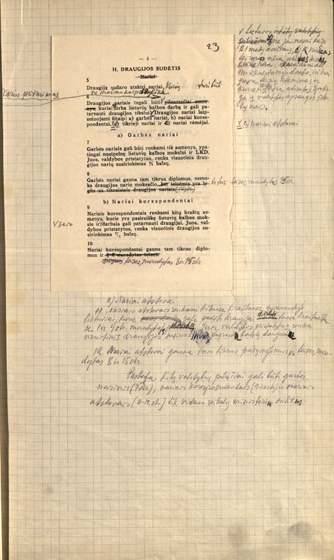Valdybos pirmininko Prano Skardžiaus redaguoti LKD įstatų puslapiai. Mašinraštis su redakciniais taisymais (dėl Draugijos tikslų, narystės, struktūros ir valdymo).