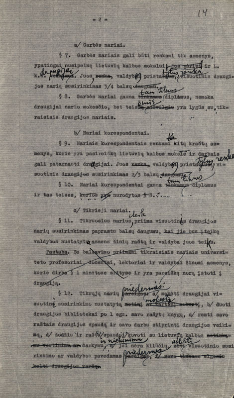 Spaustuvės rinkinio korektūros puslapiai su rankraštiniais taisymais dėl LKD narystės.