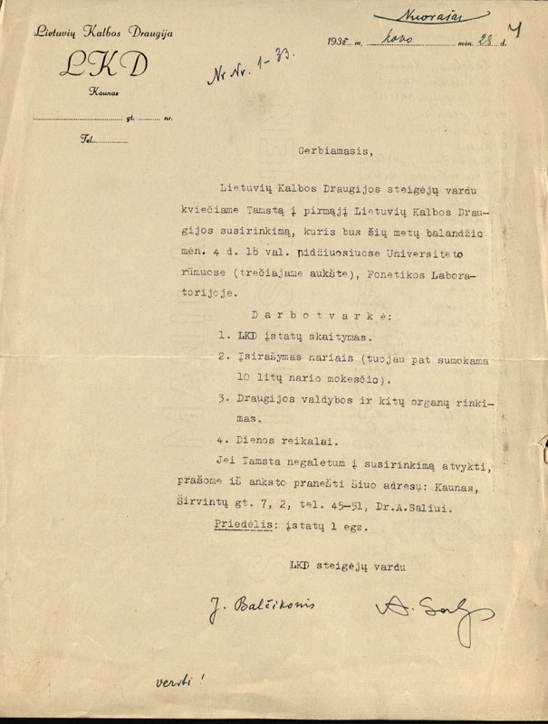 Kvietimas į steigiamąjį Lietuvių kalbos draugijos susirinkimą (1935-03-28)