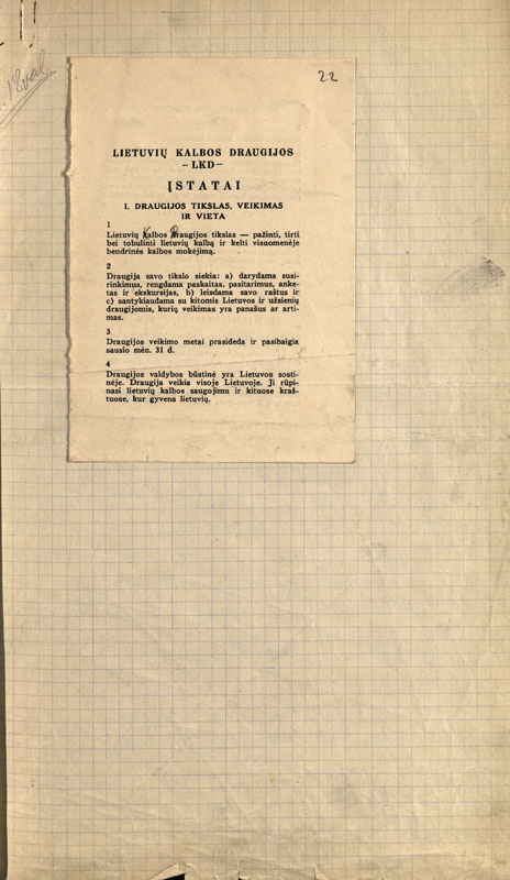 1935 m. vasario 6 d. Kauno notaro patvirtinti ir vasario 10 d. Kauno apskrities viršininko įregistruoti LKD įstatai. Mašinraštis su redakciniais taisymais (dėl nario mokesčio dydžio, narių išstojimo ir pašalinimo, visuotinio susirinkimo, valdybos, revizijos komisijos įgaliojimų ir veiklos organizavimo). Taisymai atskirai išvardyti paskutiniame mašinraščio puslapyje.