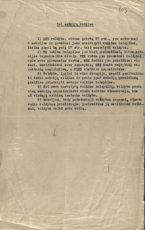Patvirtinę įstatus, LKD nariai stengėsi pagal juos vykdyti savo veiklą: rinktis į susirinkimus ir aptarti narių pranešimus kalbos klausimais, rengti valdymo organų rinkimus, tvirtinti ataskaitas, sąmatas. Suvokdami laukiančių darbų apimtį, LKD nariai siekė pasiskirstyti veiklos sritis ir į kiekvieną veiklos barą kviesti profesionaliausius asmenis. Jau antrame visuotiniame susirinkime buvo patvirtintos penkios sekcijos, sudarytos valdybos teikimu: Nuolatinė terminologijos sekcija, Viešosios kalbos sekcija, Spaudos kalbos sekcija, Mokyklinės kalbos sekcija, Užsienių lietuvių kalbos sekcija. LKD valdyba buvo nustačiusi sekcijų darbo tikslus ir taisykles, stengėsi gyvinti ir plėsti jų veiklą. Taisyklės buvo išspausdintos „Gimtojoje kalboje“ (1936, sąs. 5, p. 73–75).