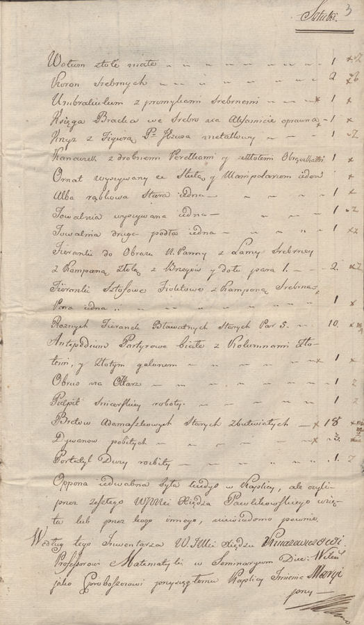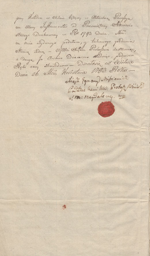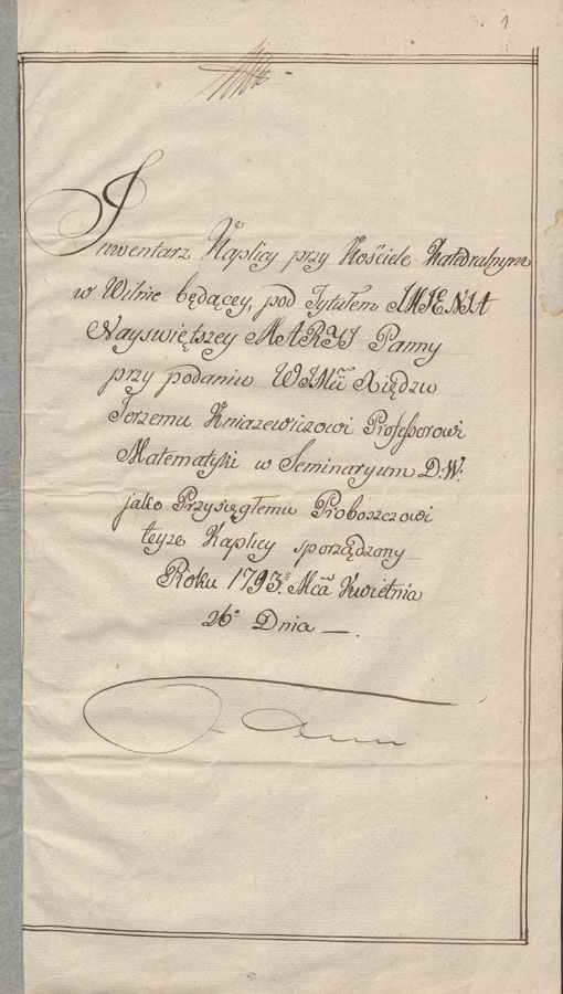 Koplyčios inventorius surašytas, ją perduodant klebonui kun. Jurgiui Kniazevičiui, Vilniaus dvasinės seminarijos matematikos profesoriui. Pasirašė kun. Ignotas Misevičius, Vilniaus universiteto dekano padėjėjas, Šv. Marijos Magdalietės bažnyčios klebonas.