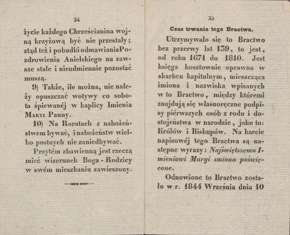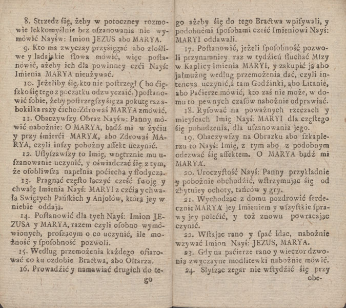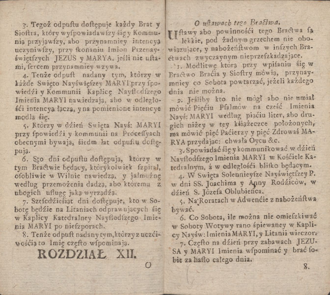 Didžiausias autoriaus dėmesys skirtas Saldžiausiojo Marijos Vardo arkibrolijai prie Vilniaus katedros: aprašytas jos steigimas, istorija, žymiausi nariai; priėmimo eiga ir priesaikos formulė, įsipareigojimai, pelnomi atlaidai. Nariai visuotinius atlaidus įprastomis sąlygomis galėjo gauti įsirašę į arkibroliją, aplankę jos koplyčią Marijos Vardo šventės oktavą (ir kiekvieną Marijos šventę); mirties akivaizdoje – lūpomis ar bent širdimi besišaukę Jėzaus ir Marijos Vardo. Marijos Vardui pasišventę broliai ir seserys turėjo laikytis 26 nuostatų punktų: pavyzdžiui, keliantis ir einant miegoti pamaldžiai ištarti Jėzaus ir Marijos vardus, nešioti kokį nors Marijos Vardo ženklą (paveikslėlį, medalėlį ar žiedą), atitinkamomis maldomis melstis Marijos Vardo garbei ir kitaip puoselėti šį pamaldumą.