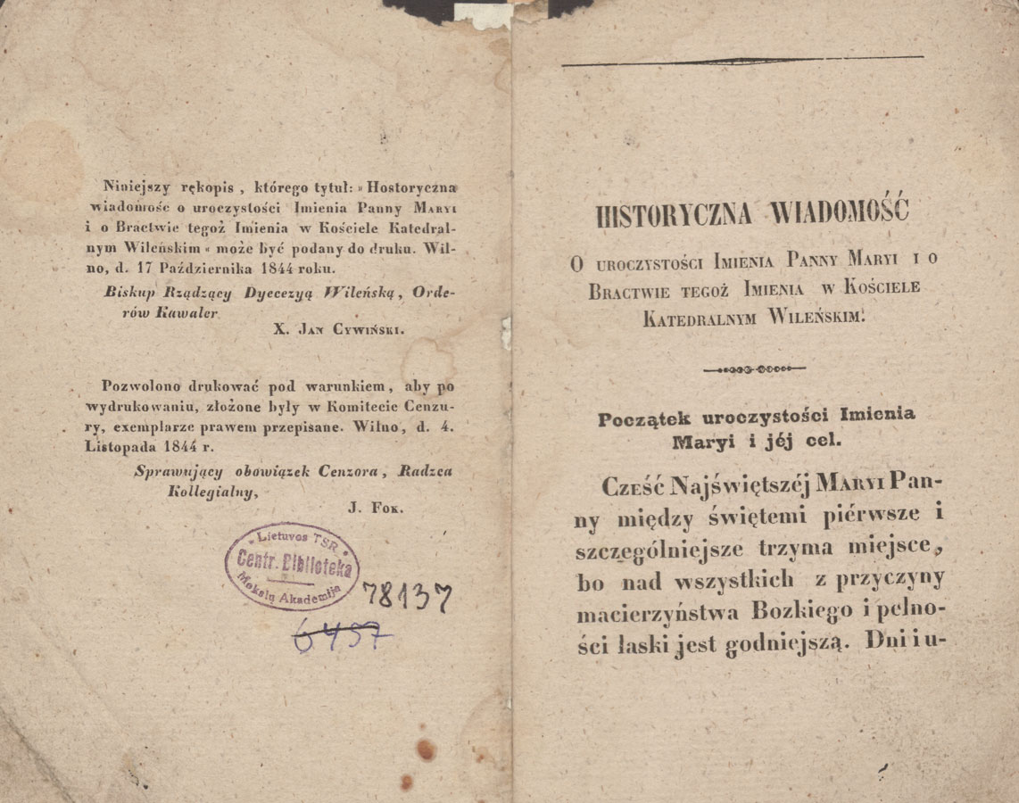 Rašoma, kad Saldžiausiojo Marijos Vardo arkibrolija be pertraukos veikė 139 metus – nuo 1671 iki 1810 metų. Po kelių dešimtmečių pertraukos, 1844 m. rugsėjo 10 d., švenčiant Marijos Vardo dieną, Vilniaus vyskupijos valdytojo Jono Civinskio pastangomis įvyko iškilmingas arkibrolijos atnaujinimas. Tuo pat metu pradėta rūpintis ir šiuo leidiniu, kaip rodo aprobata ir cenzoriaus leidimas.