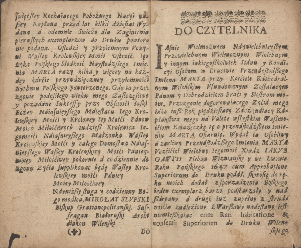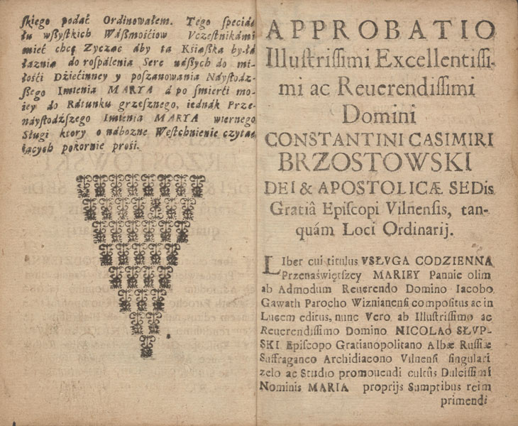 Knygai spausdinti leidimą (aprobatą) suteikęs Vilniaus vyskupas Konstantinas Kazimieras Bžostovskis pabrėžė kun. Mikalojaus Slupskio „išskirtinį uolumą ir atsidavimą, skatinant pamaldumą Saldžiausiam Marijos Vardui“ (singulari zelo ac studio promovendi cultus Dulcissimi Nominis Mariae). Leidimas suteiktas 1691 m. rugsėjo 20 d., taigi, arkibrolijos metinės šventės – Marijos Vardo minėjimo oktavos – metu. Šis maldynas atspindi pirminį arkibrolijos narių įkarštį ir dvasinį uolumą.