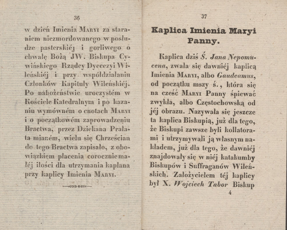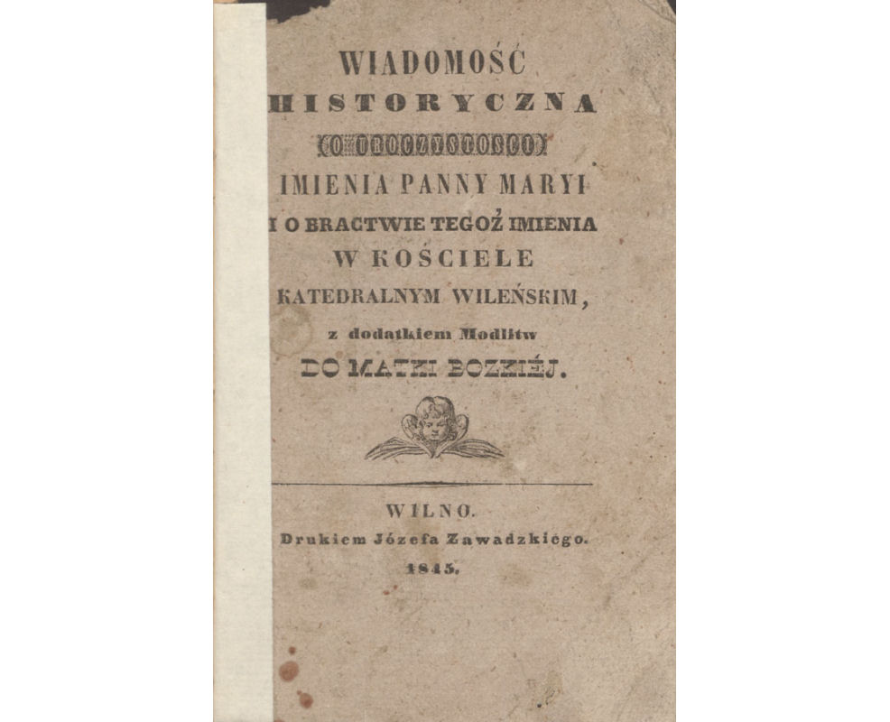 Knygelėje „Istorinės žinios apie Mergelės Marijos vardo iškilmę ir apie to paties pavadinimo broliją prie Vilniaus katedros bažnyčios“ pateikiamos istorinės žinios apie Marijos Vardo šventę ir Vilniaus katedros arkibroliją. Apžvelgiama Marijos Vardo šventės kilmė ir jos minėjimo tikslas, Marijos Vardo arkibrolijos steigimas prie Vilniaus katedros, pirmoji fundacija, atlaidai, nuostatai, koplyčios istorija. Pridėtos maldos Dievo Motinos ir kitų šventųjų garbei, naudingos nariams bei skirtos tam tikroms progoms. Beje, knygelėje išvardinta 10 nuostatų arkibrolijos nariams (1755 m. leidinyje jų buvo net 26).