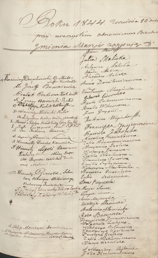 1844 m. rugsėjo 10 d. albumo įrašas skelbė apie iškilmingą veiklos atnaujinimą. Tuo metu į arkibroliją įsirašė garbingi nariai: Vilniaus vyskupas pagalbininkas Kuršui Kazimieras Dmochovskis, Vilniaus katedros klebonas prelatas Juozapas Baukevičius, dekanas prelatas Ignotas Borovskis, arkidiakonas prelatas Vincentas Mikuckis, Vilniaus katedros kapitulos kanauninkas, Žytomyro prelatas kustodas Mamertas Herburtas Fulštynietis, kiti dvasininkai ir eiliniai tikintieji (šįkart arkibrolijos narės moterys surašytos atskirai, dešinėje albumo lapo pusėje).