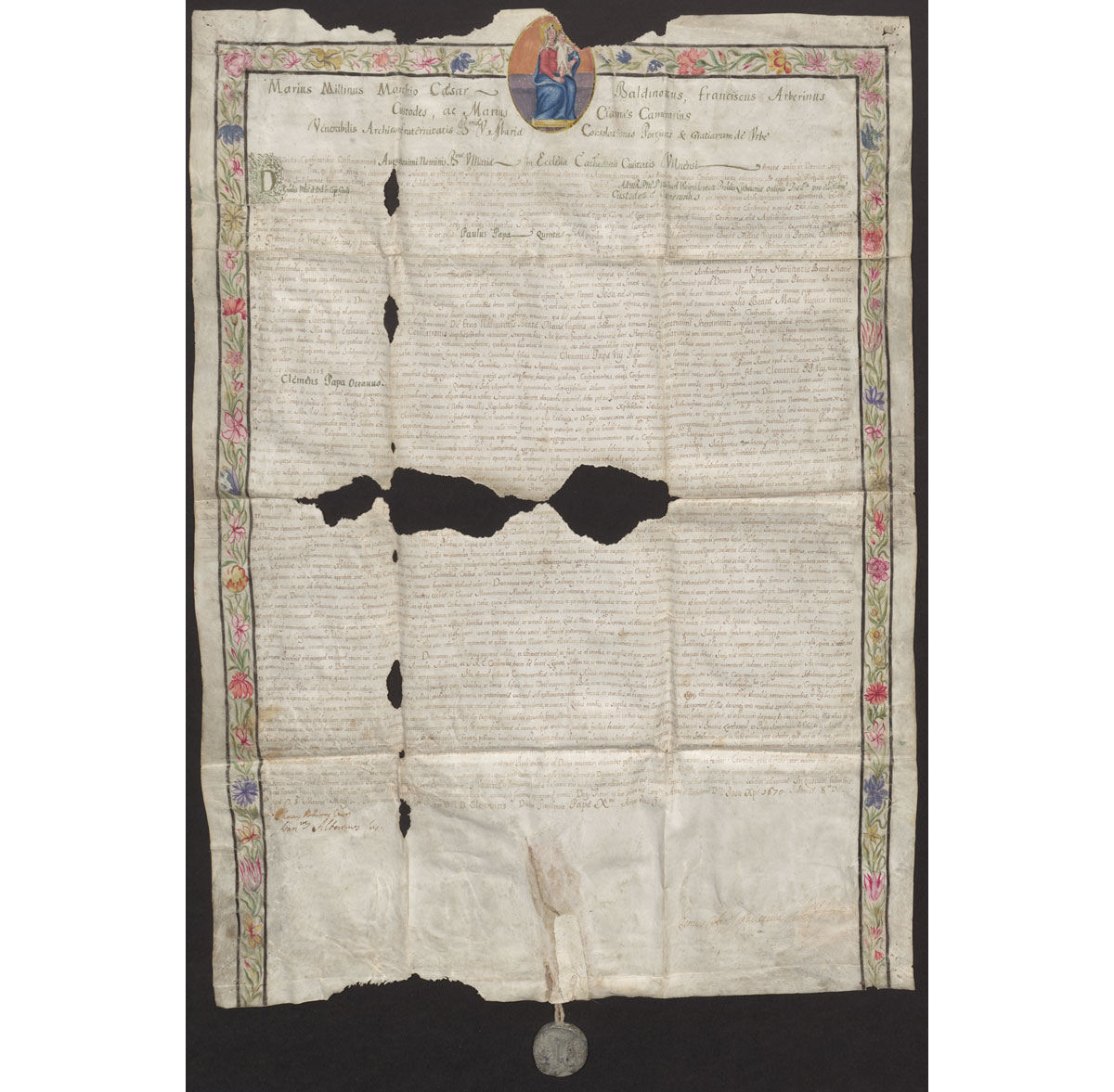 Privilegija Vilniaus katedros Švč. Mergelės Marijos brolijai. Popiežiaus Klemenso X (1590–1676) leidimu Romos Švč. Mergelės Marijos arkibrolija jai suteikia visas savo iš popiežių Klemenso VIII (1536–1605) ir Pauliaus V (1552–1621) gautas malones ir privilegijas.